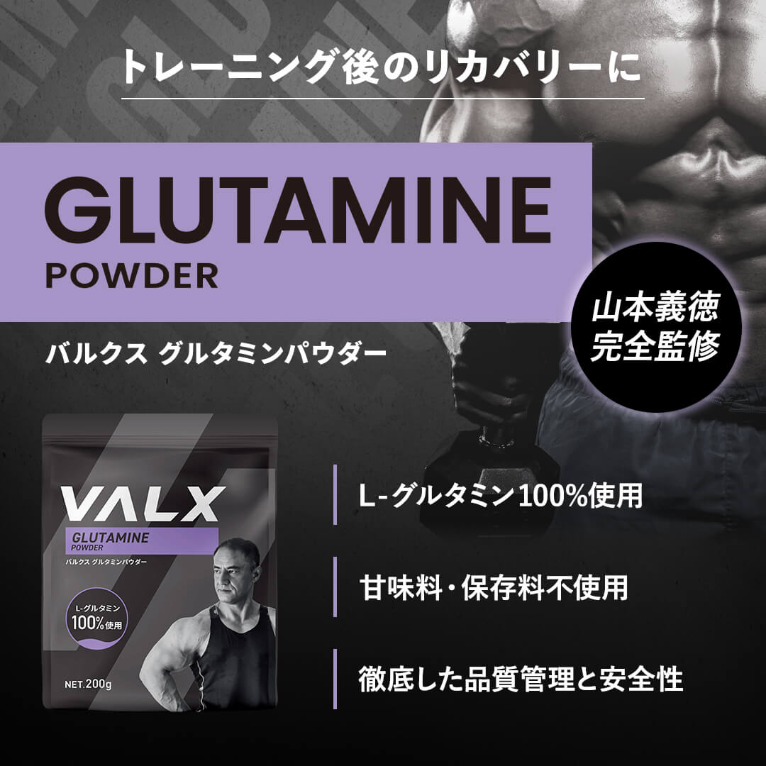 『VALXグルタミンパウダー』は甘味料・保存料を一切使用せず、飲み物にも溶けやすいグルタミンパウダーです。粉を直接口に入れて飲み物で流し込む、いわゆる「ビルダー飲み」でも飲むこともできます。就寝前に飲めば就寝中の代謝を促し、ワークアウト前後に飲めば速やかに体内への吸収をサポートします。価格帯もリーズナブルなので、継続して飲みやすいのもうれしいポイントです。