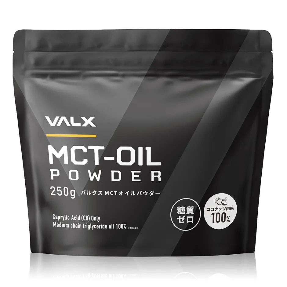 初めてMCTオイルを買う人には、山本義徳先生が監修する『VALX MCT オイルパウダー』がオススメです。100%ココナッツ由来のカプリル酸(C8)だけを使うことで、糖質ゼロを実現しました。冷たいもの・温かいものの両方に溶けやすいパウダータイプで、油浮きしないところも魅力です。